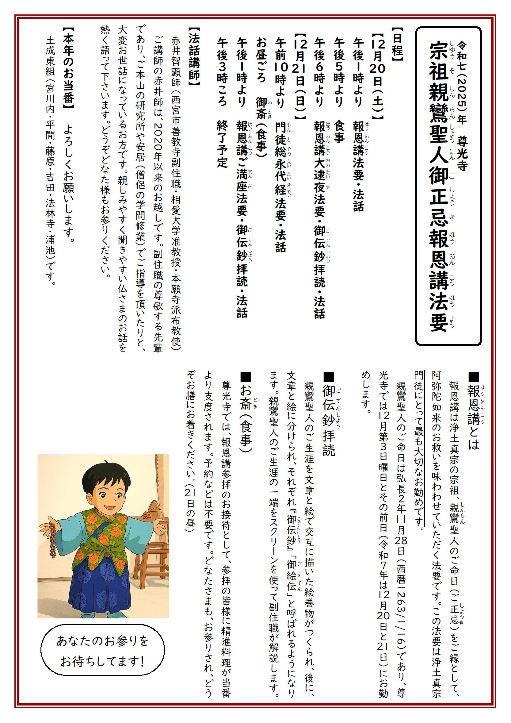 ご挨拶 尊光寺へようこそお参りになられました。 尊光寺は親鸞聖人を宗祖とする浄土真宗本願寺派(西本願寺)に所属するお寺です。徳島県阿波市市場町大野島。四国三郎吉野川の中流北岸に立地しています。 どうぞお気軽にご参拝・ご相談ください。 ▼正信偈のお勤め ▼尊光寺紹介 ご連絡先 0883-36-3026 / sonkoji.templeあっとまーくgmail.com