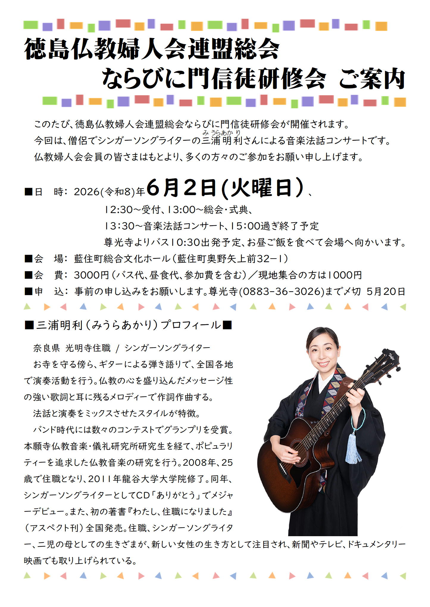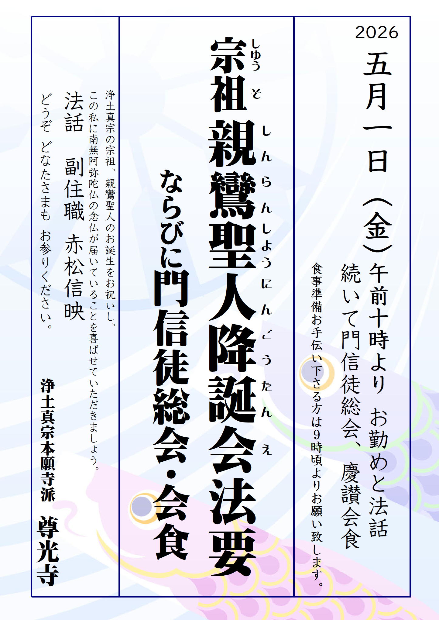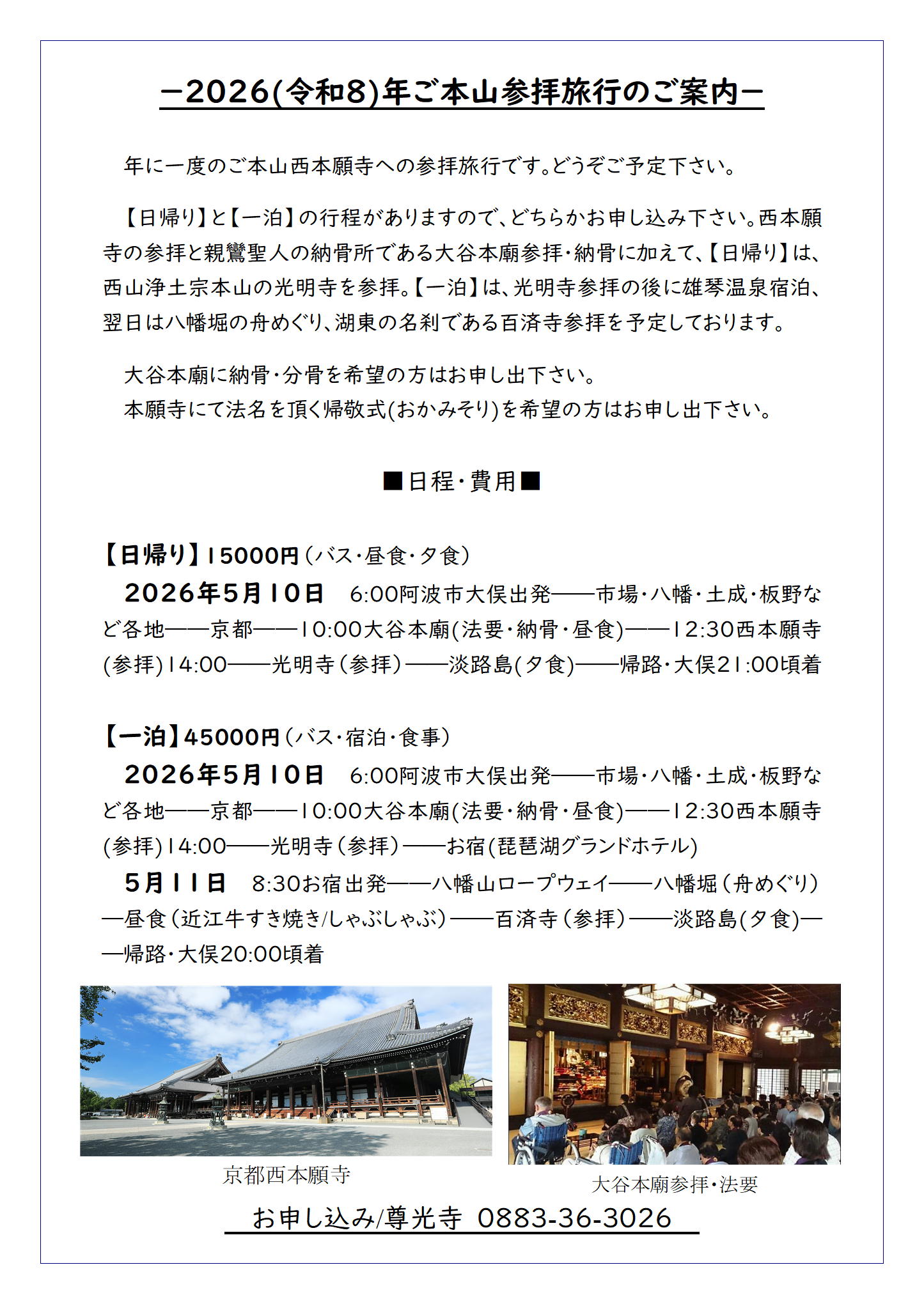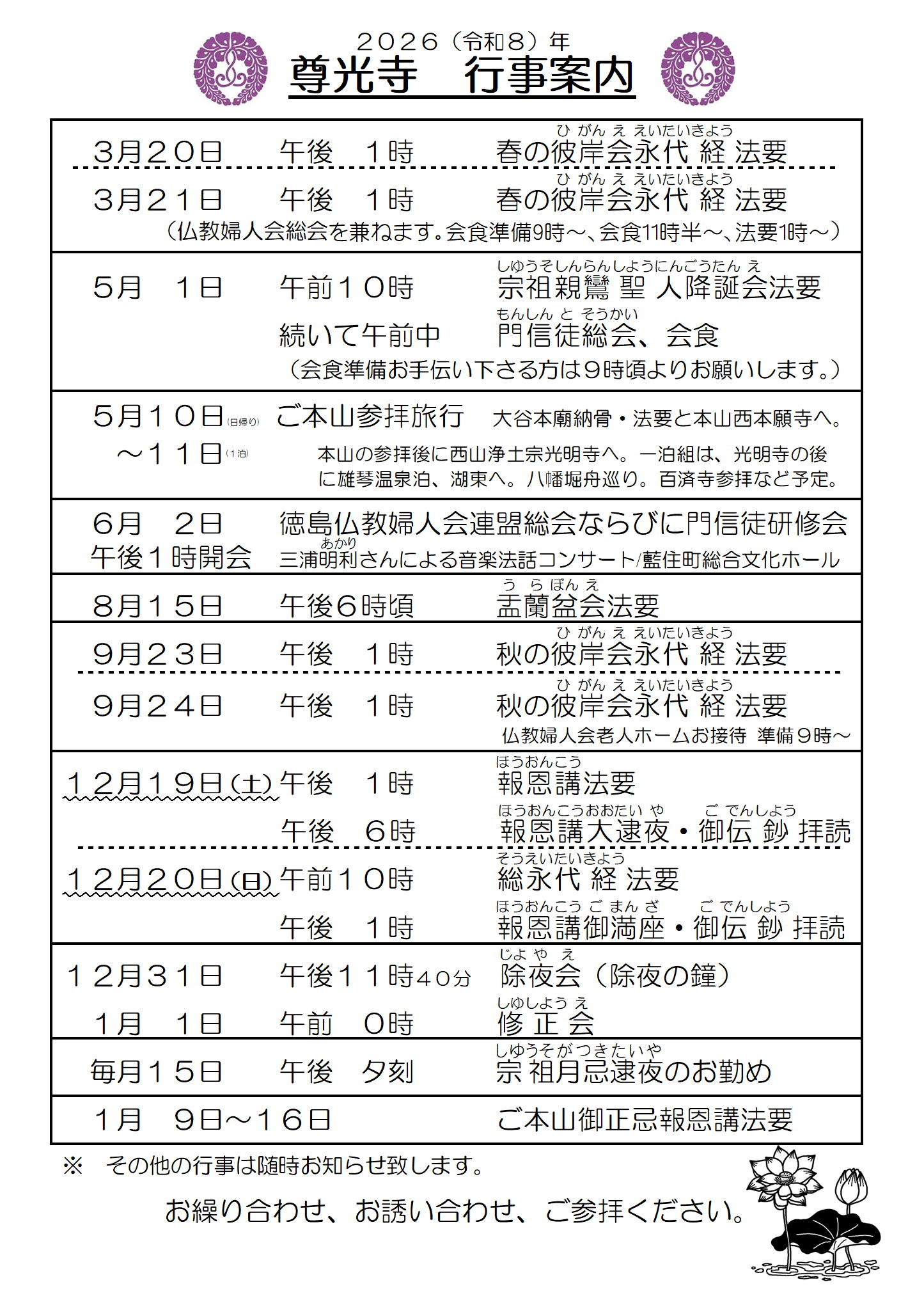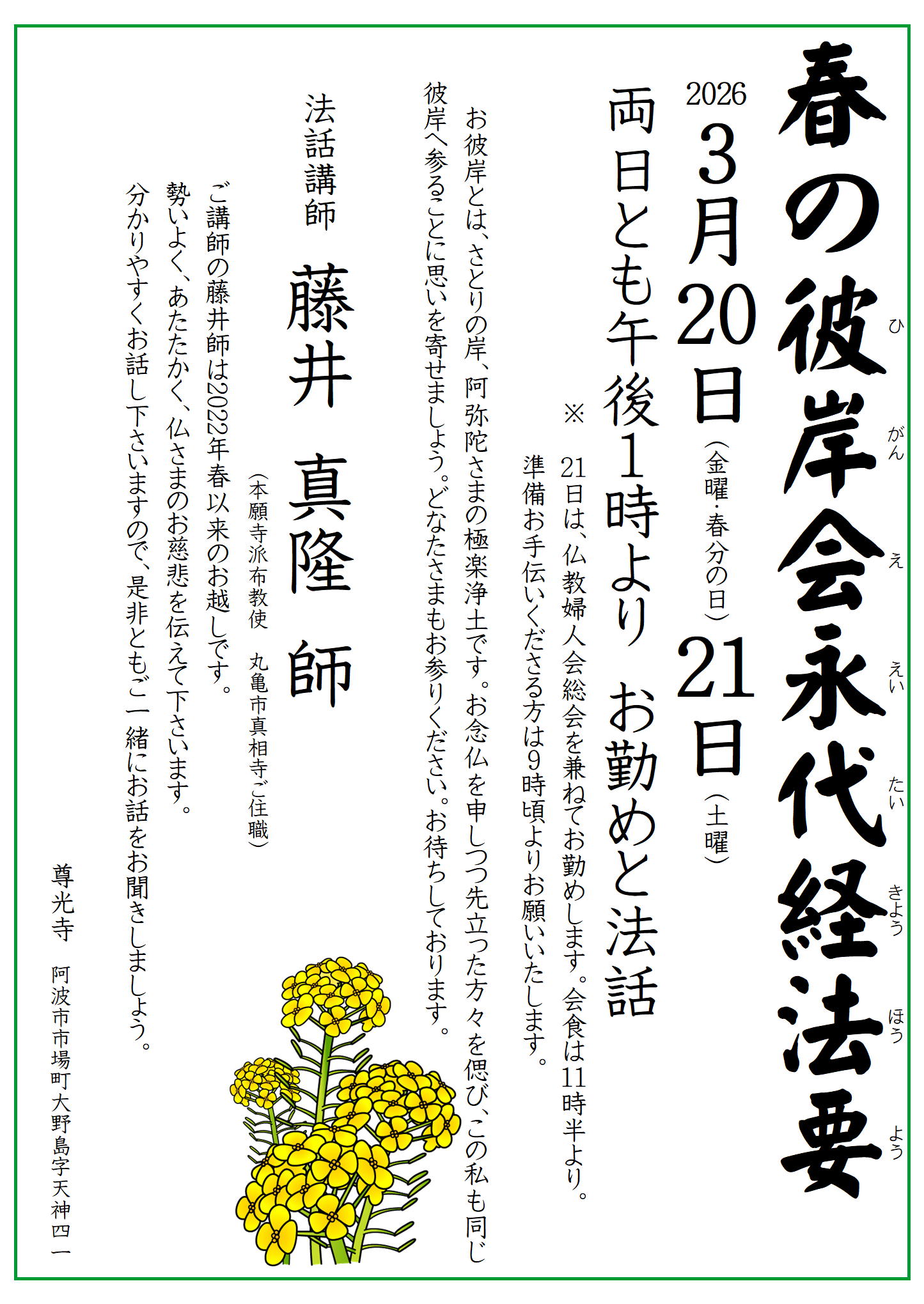 ご挨拶 尊光寺へようこそお参りになられました。 尊光寺は親鸞聖人を宗祖とする浄土真宗本願寺派(西本願寺)に所属するお寺です。徳島県阿波市市場町大野島。四国三郎吉野川の中流北岸に立地しています。 どうぞお気軽にご参拝・ご相談ください。 ▼正信偈のお勤め ▼尊光寺紹介 ご連絡先 0883-36-3026 / sonkoji.templeあっとまーくgmail.com